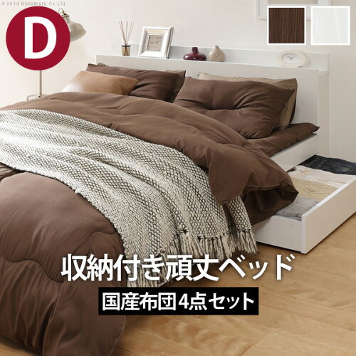 ベッド 布団 セット 敷布団でも使えるフラットストレージベッド 〔カルバンストレージ〕 ダブルサイズ+国産洗える布団4点セット ベッドフレーム 木製 ベッド下収納 宮付き コンセント 布団セット 日本製 掛け布団 敷き布団 ピーチスキン